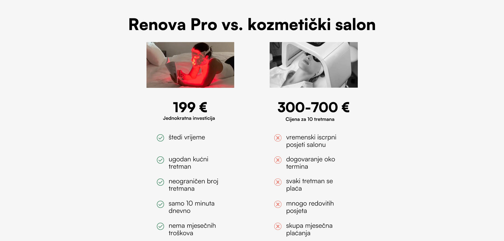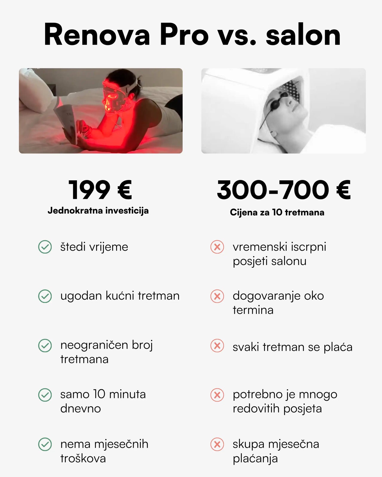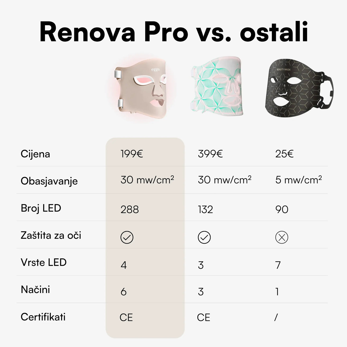 S pravom kozmetikom možeš puno postići – a uz Renova Pro svoju ćeš njegu podići na potpuno novu razinu. LED svjetlo doprinosi ljepšem i ujednačenijem izgledu kože te pomaže u poticanju proizvodnje kolagena, koji je osnova za zdrav i blistav ten. Vrijeme je da svoju beauty rutinu nadogradiš tehnologijom koja je sve popularniji dio moderne njege kože kod kuće i diljem svijeta.