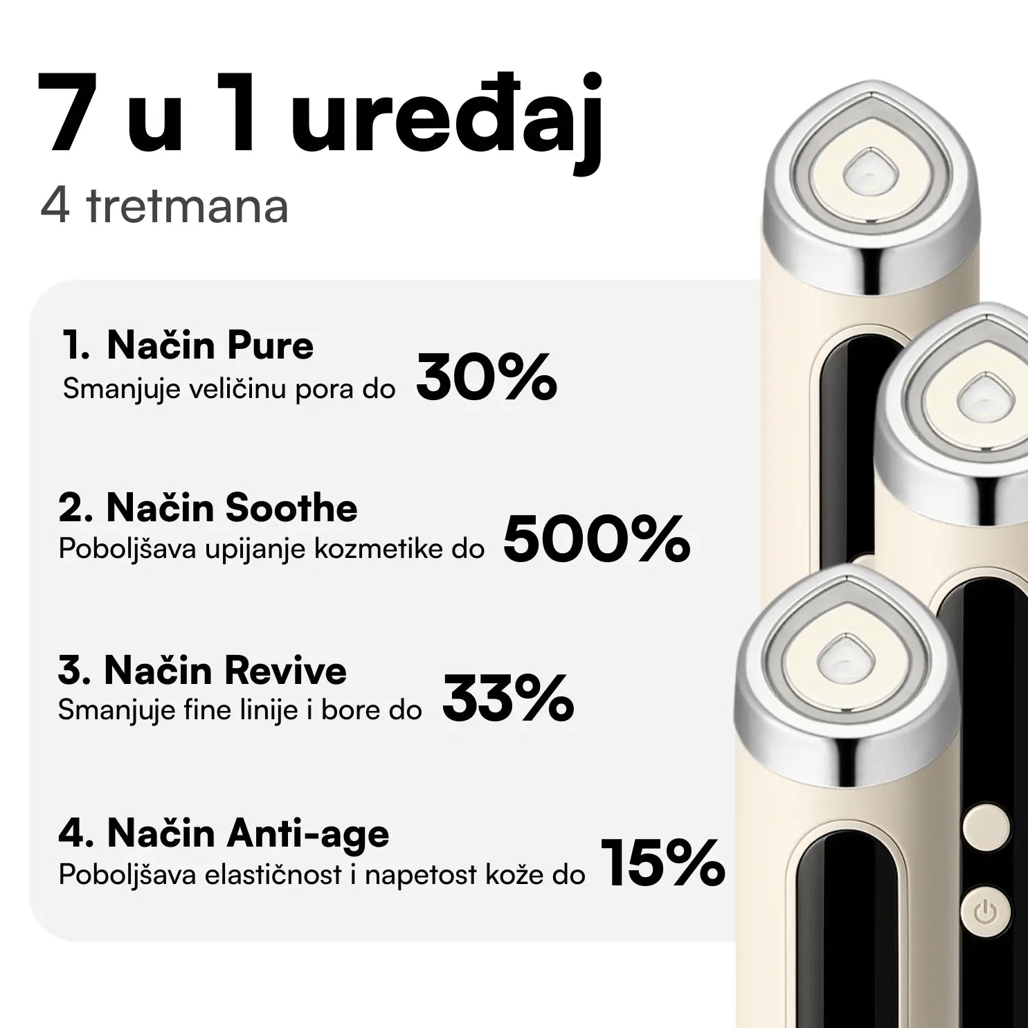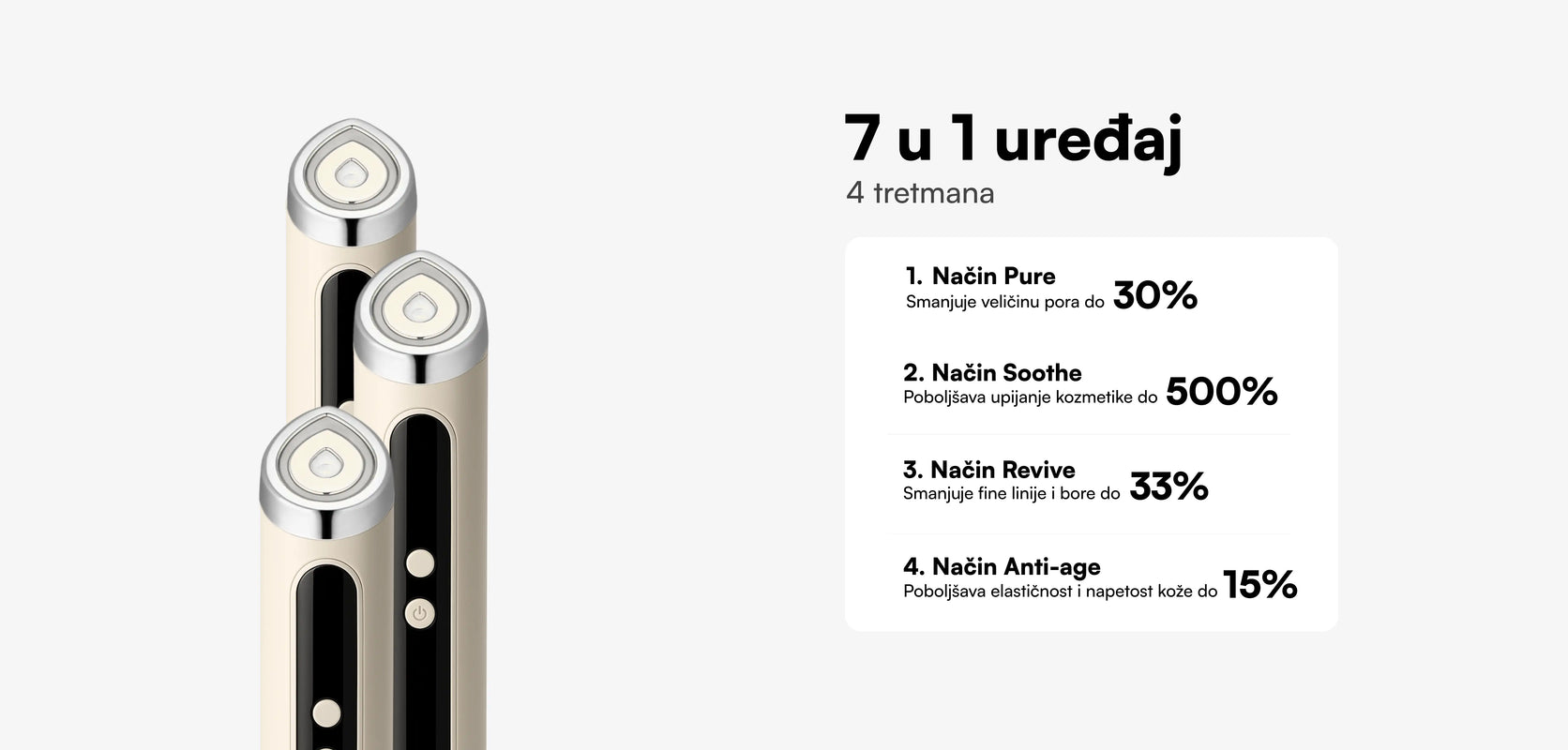 3. Način Soothe: nakon nanošenja kozmetike (serum, krema ili maska) kružnim pokretima prelazi preko lica od nosa prema ušima – uvijek prema van. Koristi 5 – 10 minuta po tretmanu. Kada se koristi sa serumom, bolje će se upiti u kožu i imati veći učinak.