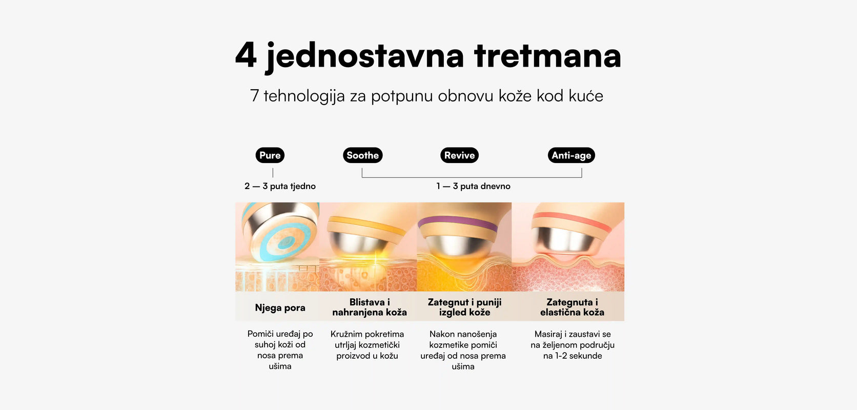 U načinu Pure počni sa suhom kožom, a za ostale načine nanesi lagani serum, a zatim bogatiju, gušću kremu ili gel. Nakon njege u načinu Soothe možeš se prebaciti na načine Anti-age i Revive s ostatkom proizvoda na koži, bez dodatnog nanošenja. Ako ti se intenzitet čini preniskim, dodajte više kozmetičkog proizvoda.