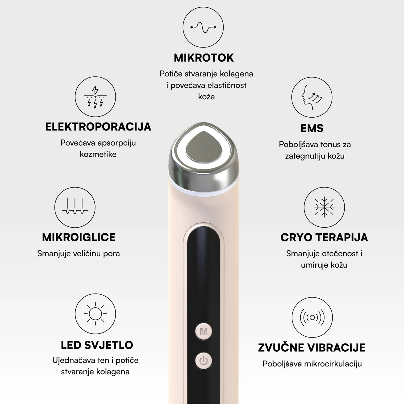 Stvara bezopasne mikrokanale u koži za smanjenje pora i povećanje elastičnosti kože. Plavo LED svjetlo uništava bakterije koje uzrokuju akne, a hlađenje smanjuje otečenost.